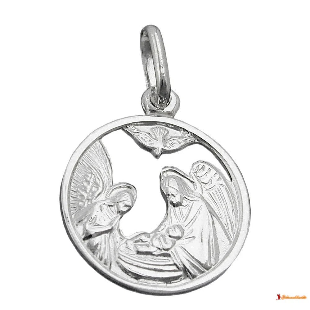 Der Anhänger 15mm Maria und Josef ausgestanzt glänzend Silber 925 ist ein wunderschönes religiöses Schmuckstück, das mit viel Liebe und Sorgfalt in hochwertiger Juwelierqualität gefertigt wurde. Dieser glänzende Anhänger zeigt das detailreiche Bildnis von Maria und Josef, die sich liebevoll über das Jesuskind in der Krippe beugen. Über dieser berührenden Szene schwebt der Heilige Geist in Form einer Taube und verleiht diesem Anhänger eine besondere spirituelle Bedeutung.