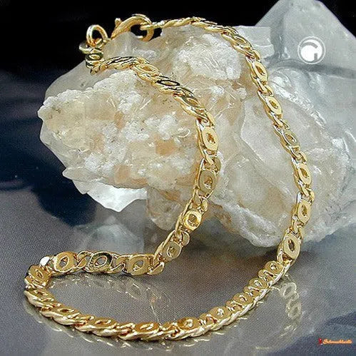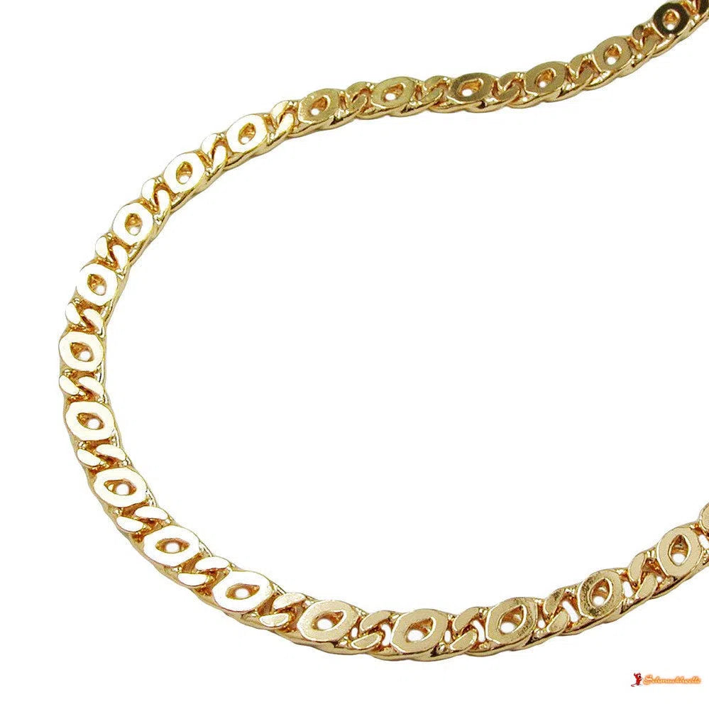 Elegantes Collier Tigerauge, 3mm breit und 1mm dick, zweifach diamantiert (geschliffen), mit hochwertiger Vergoldung in Juwelierqualität. Das Tigerauge-Kettenmuster zählt zu den klassischen Standardkettenmustern und ist weich und angenehm fallend. Das Grundmaterial ist eine Tombaklegierung (Messinglegierung). Die sehr gute Doublé-Vergoldung bürgt für lange Haltbarkeit und Freude mit dieser schönen Halskette.