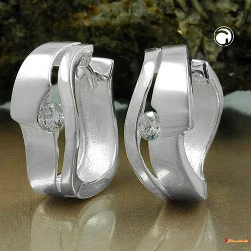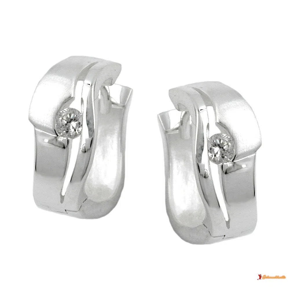 Wunderschöne Creolen mit Klappverschluss in bester Juwelierqualität in Sterling Silber 925 - dieser 16x7mm große Ohrschmuck ist einen Hingucker wert! Die interessante Vorderansicht teilt sich in zwei unterschiedlich breite, geschwungene Schienen, in der Mitte mit einem kleinen, weißen Zirkonia verziert, die breitere Schiene ist im oberen Teil matt gebürstet, die Rückseite ist glänzend. Ob zu festlichen Anlässen oder stilecht ins Büro - mit diesen eleganten Scharniercreolen haben Sie immer einen glänzenden Auftritt!