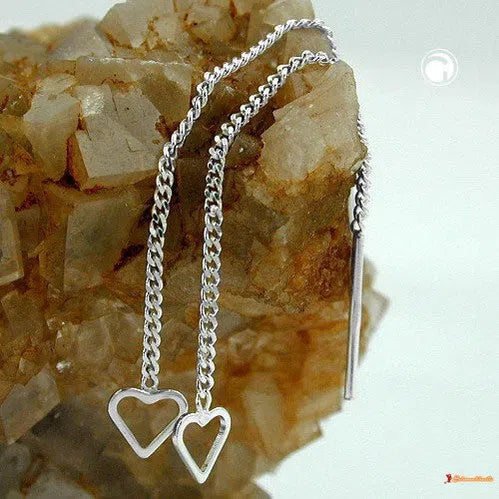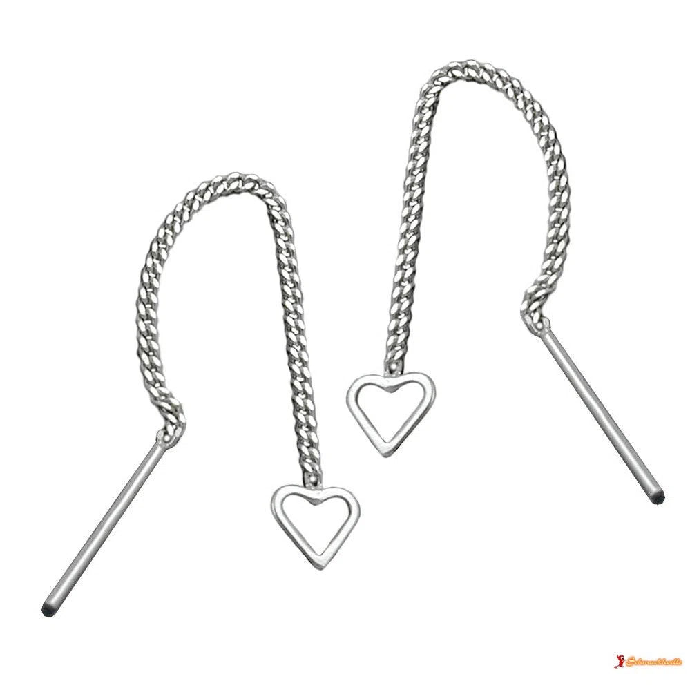 Beliebter Ohrschmuck mit Herz - Durchzieher - Einfädler - Thread-Ohrring - in Sterling Silber 925, verarbeitet in hochwertiger Juwelierqualität. An einem 1mm dünnen Panzerkettchen hängt ein ca. 4,5mm kleines Herz, nur als Rahmen angedeutet, innen offen. Die Gesamtlänge des kurzen Durchziehers beträgt ca. 49mm. Wie ein Faden baumelt der Durchzieher lang hinter dem Ohr und bringt den dekorativen Sternchen-Abschluss zur richtigen Geltung. Die federleichten Ohrhänger fallen auch bei längerer Haarfrisur auf und spielen angenehm am Hals. Ohrschmuck betont zusätzlich das Gesicht und rundet Ihren Auftritt glanzvoll ab. Dieser Ohrring ist auch als Kinderschmuck und Teenagerschmuck beliebt.