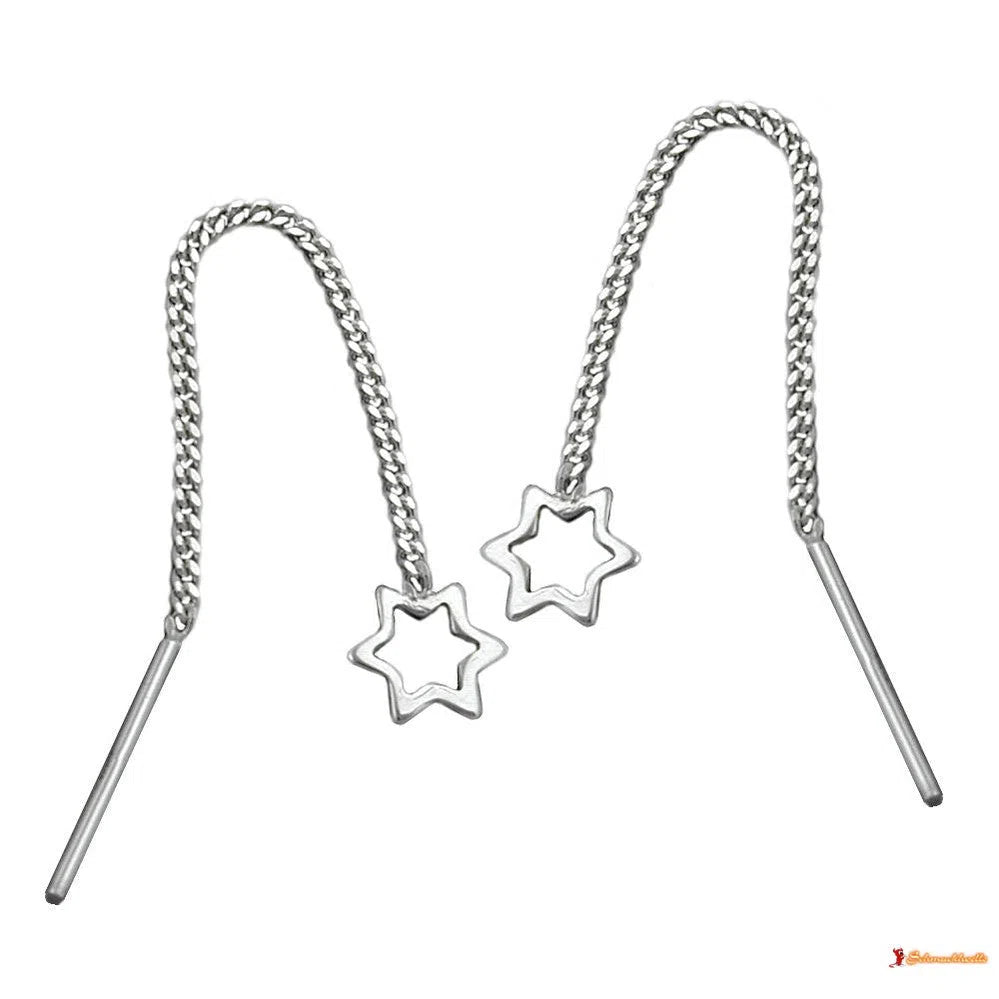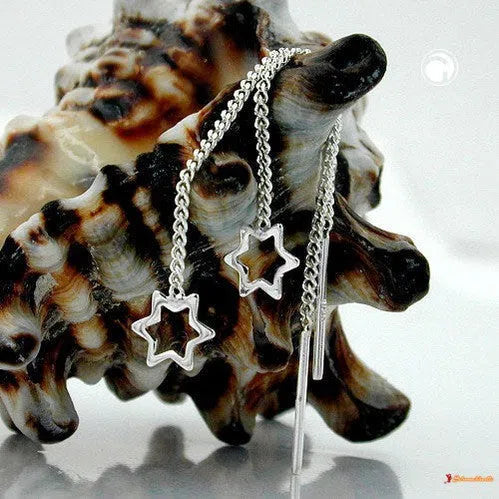 Beliebter Ohrschmuck mit Stern - Durchzieher - Einfädler - Thread-Ohrring - in Sterling Silber 925, verarbeitet in hochwertiger Juwelierqualität. An einem 1mm dünnen Panzerkettchen hängt ein 6mm kleiner Stern, nur als Rahmen angedeutet, innen offen. Die Gesamtlänge des kurzen Durchziehers beträgt ca. 50mm. Wie ein Faden baumelt der Durchzieher lang hinter dem Ohr und bringt den dekorativen Sternchen-Abschluss zur richtigen Geltung. Die federleichten Ohrhänger fallen auch bei längerer Haarfrisur auf und spielen angenehm am Hals. Ohrschmuck betont zusätzlich das Gesicht und rundet Ihren Auftritt glanzvoll ab. Dieser Ohrring ist auch als Kinderschmuck und Teenagerschmuck beliebt.