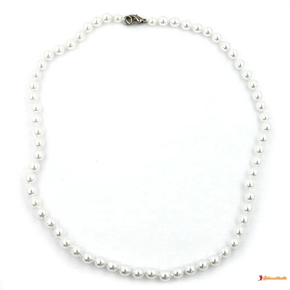 Collier mit Glasperlen wachsweiß überzogen, zwischen den Perlen geknotet, Verschluss silber-farbig