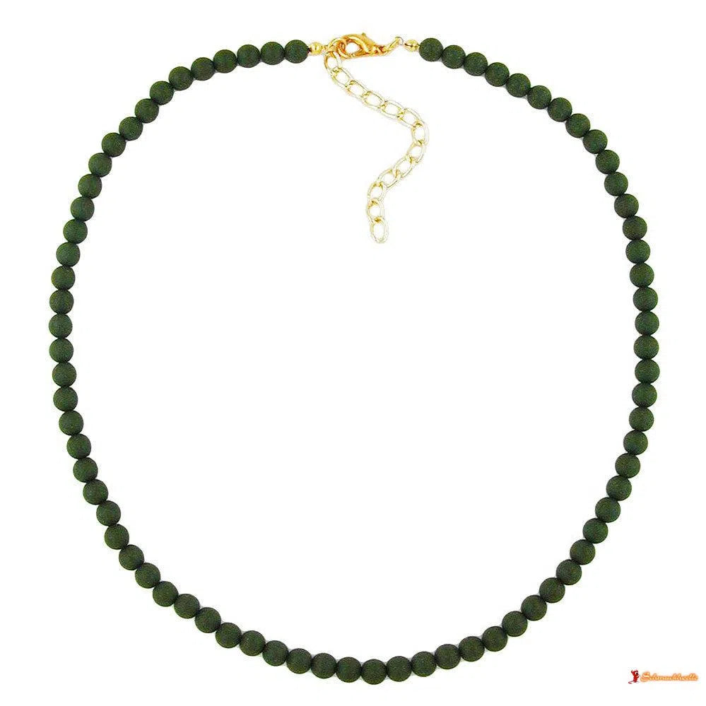 zeitloses Collier mit 6mm Kunststoffperlen oliv-matt, Verschluss vergoldet mit Verlängerungskettchen, in Deutschland gefertigte Handarbeit