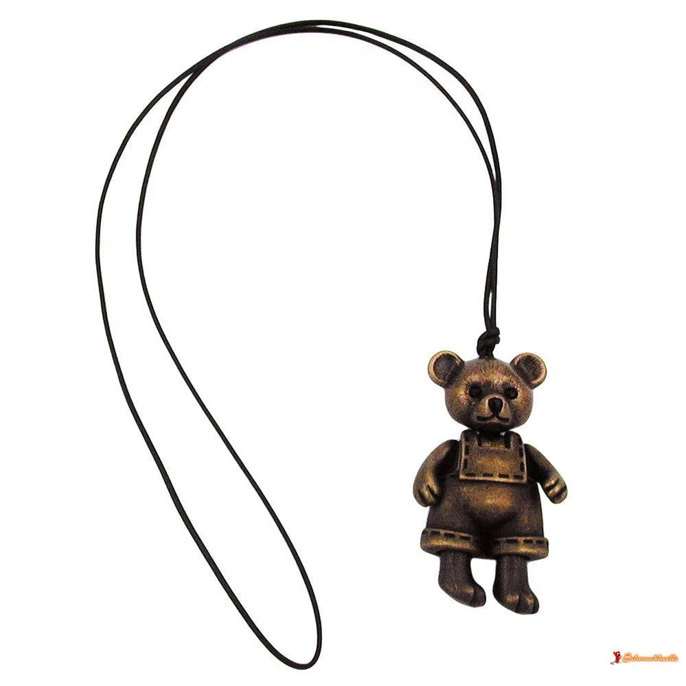 Ein putziges Collier für alle jung gebliebenen Teddy-Liebhaber! Teddybär mit lustigem Gesicht aus Kunststoff-Teilen, altmessing galvanisch, alle Teile beweglich, an 1,2mm Kordel schwarz, in Deutschland gefertigte Handarbeit