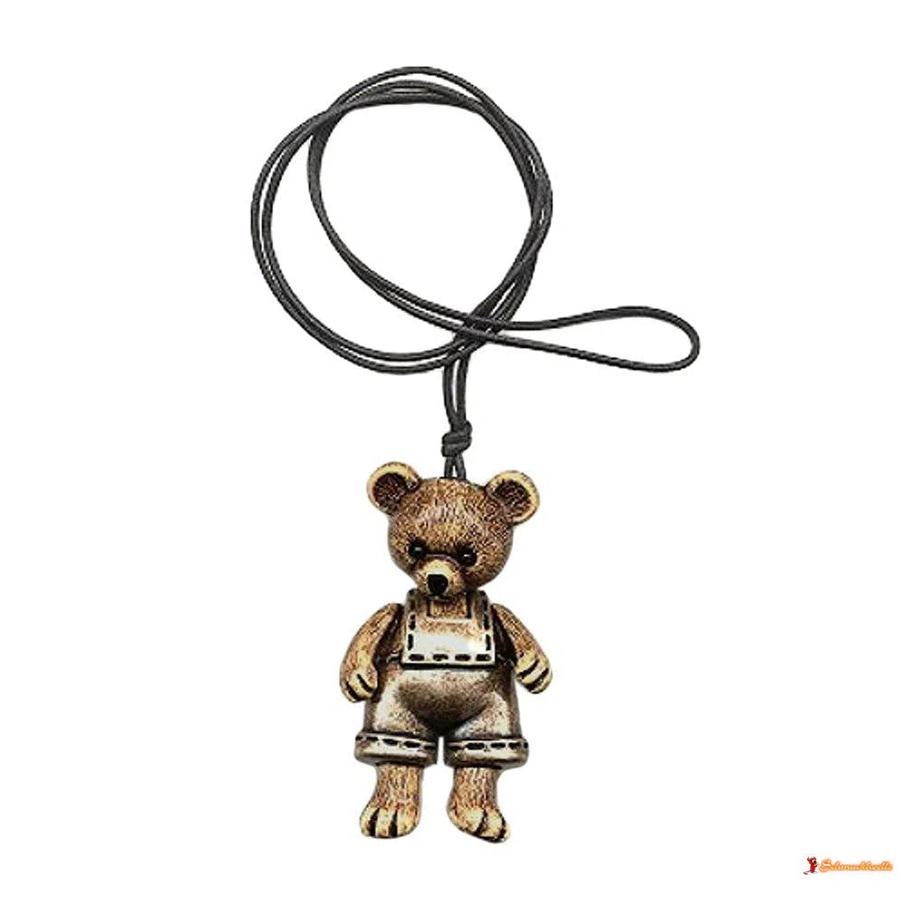 Ein putziges Collier für alle jung gebliebenen Teddy-Liebhaber! Teddybär mit lustigem Gesicht aus Kunststoff-Teilen, die Hose ist altmessing galvanisch und die restlichen Teile stilecht in braun, alle Teile beweglich, an 1,2mm Kordel schwarz, in Deutschland gefertigte Handarbeit