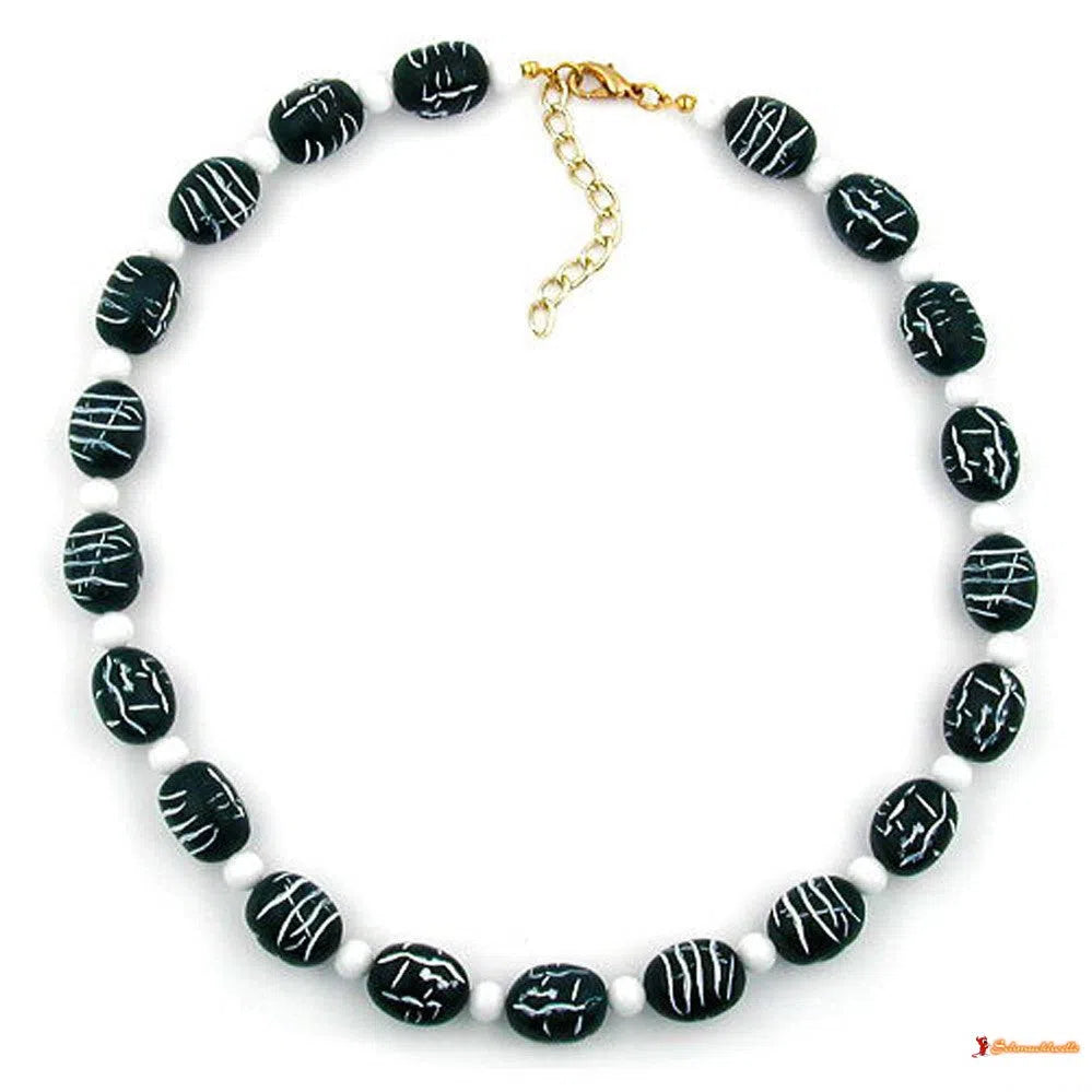 dekoratives Collier mit Kunststoff-Perlen in Steinform dunkelgrün-weiß, kombiniert mit Kunststoffperle weiß, abwechselnd gefädelt, Verschluss gold-farbig mit Verlängerungskettchen, in Deutschland gefertigte Handarbeit