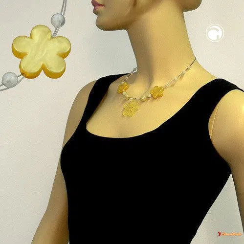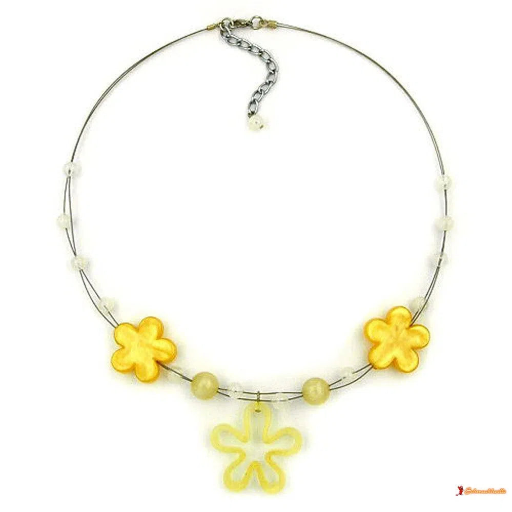 Collier in aktueller Sommerfarbe gelb, dekorative Blumenperlen farblich abgestimmt mit Perlen in beige und gelb seidig-glänzend, auf 2-fach Draht silber-farbig kunststoffummantelt, Verschluss silber-farbig mit Verlängerungskettchen und Perle als Abschluss, in Deutschland gefertigte Handarbeit