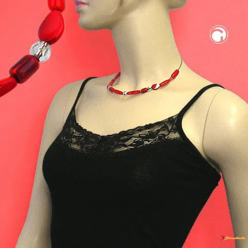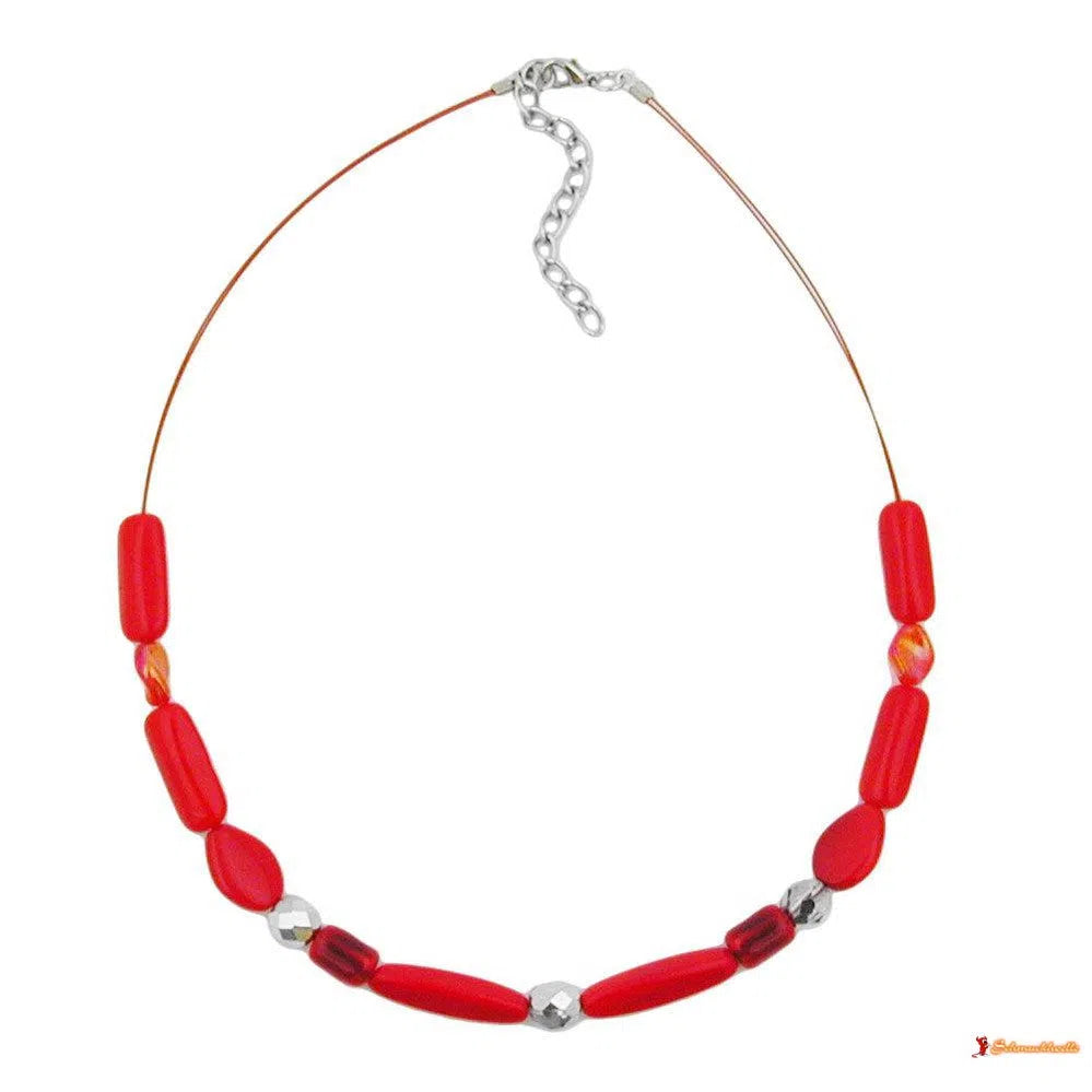 Entdecken Sie die exquisite Kette Drahtkette mit Glasperlen rot-geflammt 42cm, ein Schmuckstück, das Eleganz und Stil vereint. Diese atemberaubende Drahtkette besticht durch ihre hochwertigen Glasperlen in einem leuchtenden Rot, die zusammen mit facettierten Perlen in kristall-silber-verspiegelt eine harmonische Kombination bilden. Der doppelte, kunststoffummantelte Edelstahldraht legt sich sanft und geschmeidig um Ihren Hals und sorgt für einen angenehmen Tragekomfort.