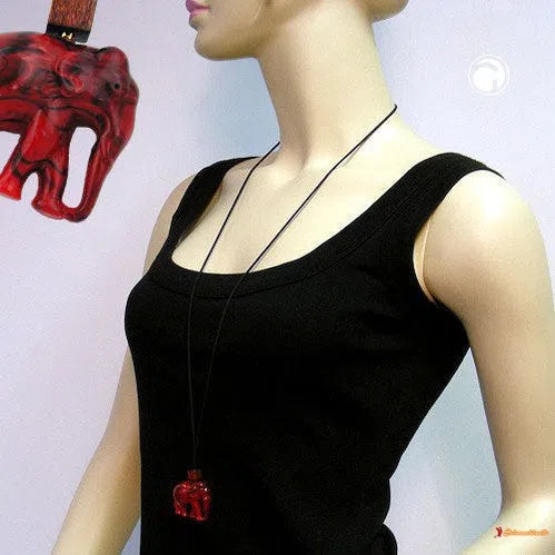 Collier mit detailgetreuer Nachbildung eines Elefants, aus Kunststoff 35x32mm dunkelrot-schwarz-marmoriert, durchgängig gefärbt und nicht aufgespritzt, mit Holzperle, an 1mm Kordel schwarz, in Deutschland gefertigte Handarbeit
