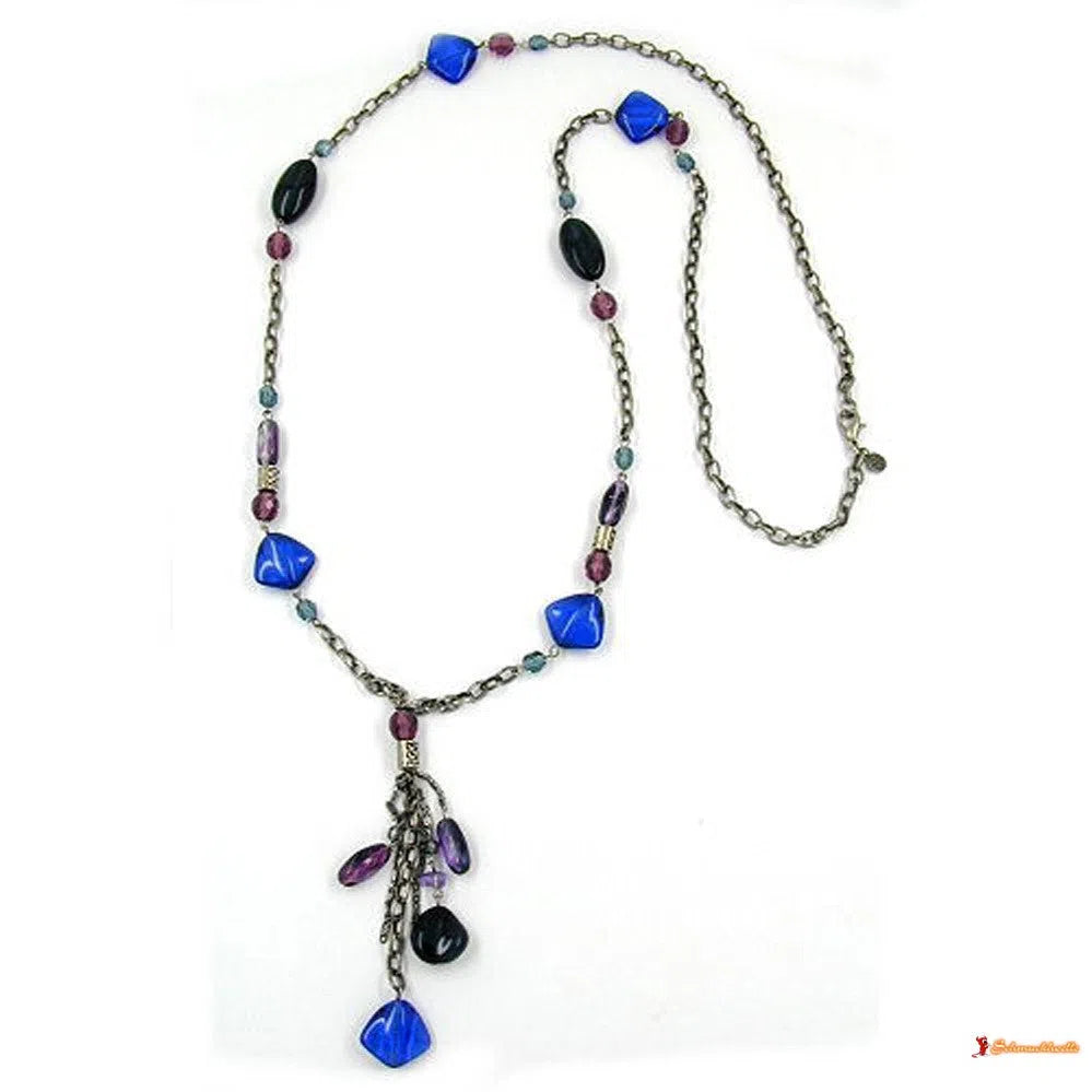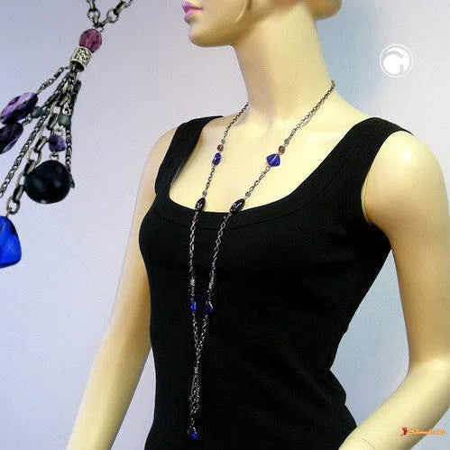 hochwertiges Collier in Y-Form mit Glasperlen gekettelt, Perlen blau-violett und altsilber-farbig, verbunden mit Aluminium-Ankerkette altsilber