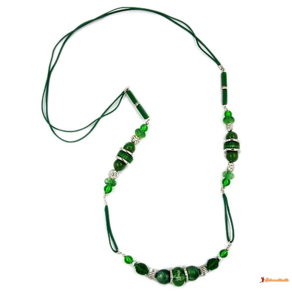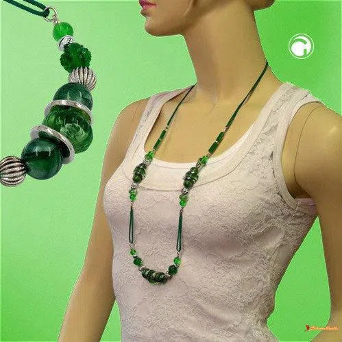 dekoratives Collier mit veschiedenen Kunststoffperlen in grün-transparent und grün-marmoriert, kombiniert mit ausgefallenen Perlen in silber-farbig, Kordel 1mm grün, in Deutschland gefertigte Handarbeit