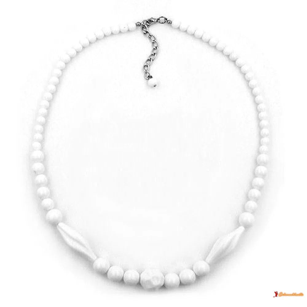 sommerliches Collier mit hochwertigen Kunststoffperlen weiß-glänzend in ausgefallenen Formen, Verschluss silber-farbig mit Verlängerungskettchen und Perle als Abschluss, in Deutschland gefertigte Handarbeit