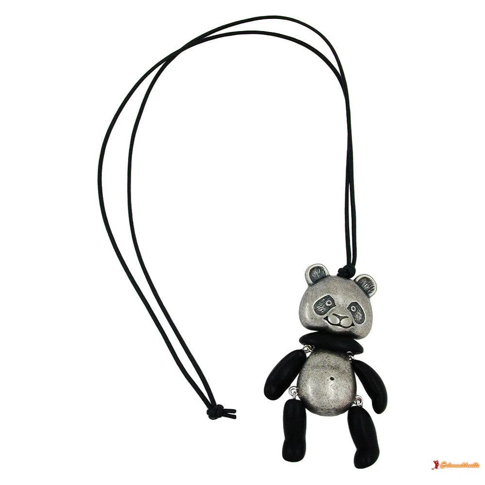 putziger Anhänger lustige Nachbildung eines Pandabär, aus Kunststoff-Teilen Körper und Kopf altsilber galvanisch und restliche Teile schwarz-matt, an 1,2mm Kordel schwarz, in Deutschland gefertigte Handarbeit