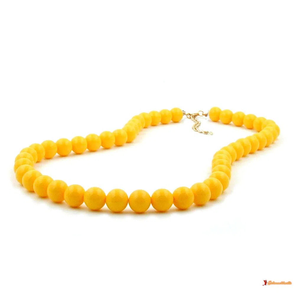 sommerliches Collier mit 8mm Kunststoff-Perle gelb-glänzend, Verschluss gold-farbig mit Verlängerungskettchen, in Deutschland gefertigte Handarbeit