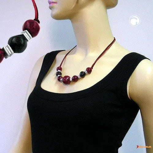 Collier mit hochwertigen Kunststoffperlen in den Größen 24,22 und 14mm und den Farben fuchsia, bordeaux und schwarz in Kombination mit kleinen Kunststoffteilen in hellgrau, Kordel 0,6mm rot und Velourband rot, Verschluss silberfarbig mit Verlängerungskettchen, in Deutschland gefertigte Handarbeit