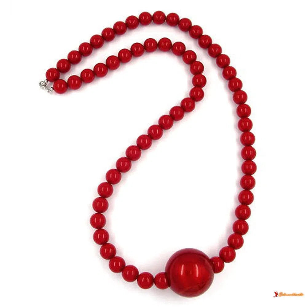 dekoratives Collier mit 12mm Kunststoffpelen rot-glänzend, besonderer Blickfang ist eine 35mm Kunststoffkugel rot seidig-glänzend, Verschluss silberfarbig, in Deutschland gefertigte Handarbeit