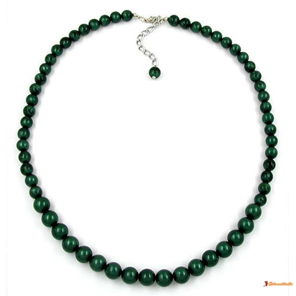 zeitloses Collier mit Kunststoffperlen 8 und 10mm flaschengrün seidig-glänzend, Verschluss silberfarbig mit Verlängerungskettchen und Perle als Abschluss, in Deutschland gefertigte Handarbeit