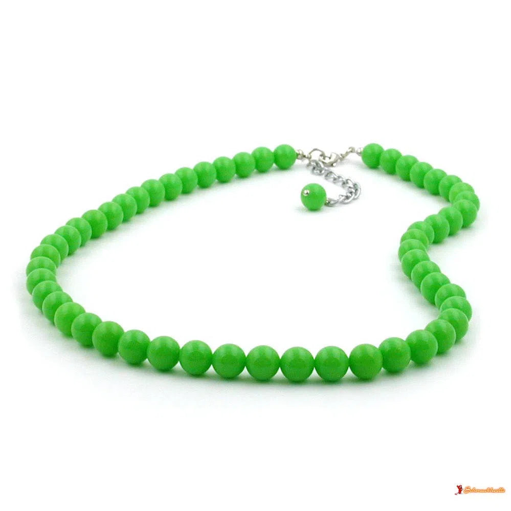 Total angesagt in diesem Sommer sind Colliers in wunderschön leuchtenden Farben. Diese Modeschmuck-Kette aus Kunststoffperlen mit 8mm Durchmesser in einem frischen Apfelgrün passt wunderbar zur Damenmode in vielen bunten Tönen, kann aber auch ein Eye-Catcher zu unifarbigen Oberteilen sein. Der Verschluss ist silber-farbig und hat ein Verlängerungskettchen. Alle Bestandteile dieser Modeschmuck-Kette wurden in Deutschland produziert und die Kette selbst in Handarbeit - made in germany - fertiggestellt.