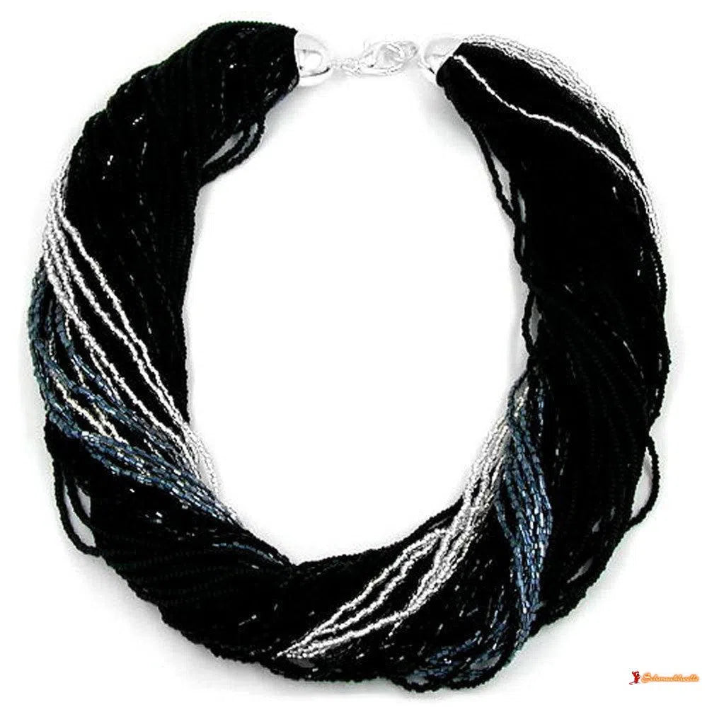dekoratives, aufwendig gearbeitetes Collier, 51-reihig, Glasperlen schwarz und silberfarbig überzogen, Verschluss Karabiner silberfarben