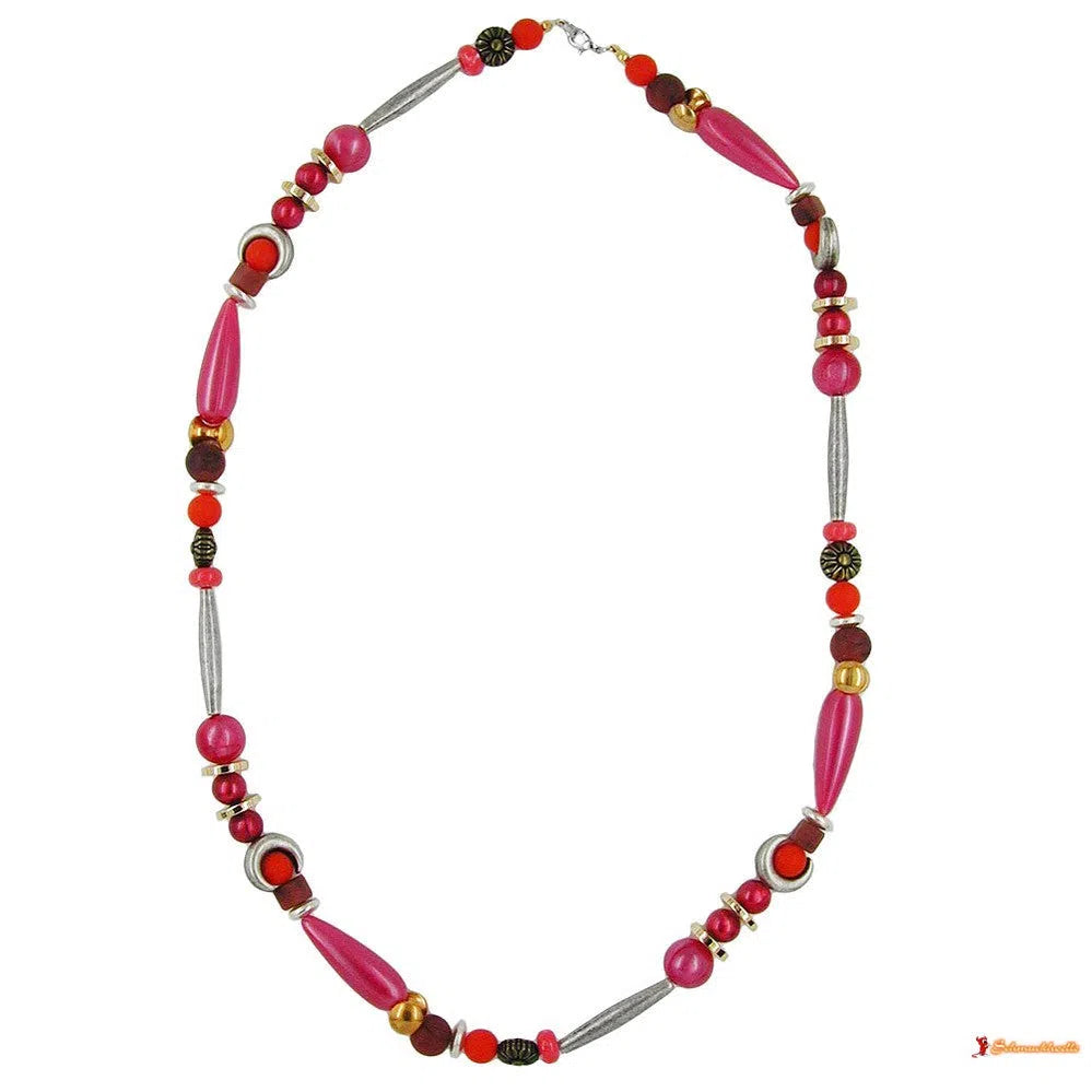- Farbenfrohe Kunststoffperlen: Die Kette besteht aus einzigartigen Kunststoffperlen in verschiedenen Rottönen, die perfekt aufeinander abgestimmt sind.