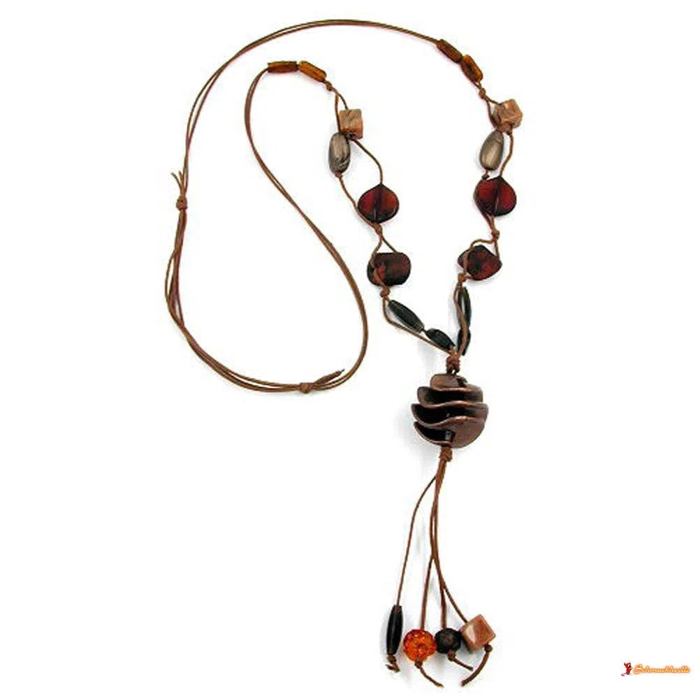 Collier mit ausgefallenen Kunststoffperlen in braun- und beige-Tönen, besonderer Blickfang ist die Spiralperle, 2-fach Kordel 0,6mm in braun, längenverstellbar mittels Schiebeknoten, in Deutschland gefertigte Handarbeit