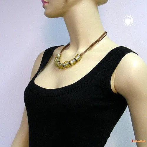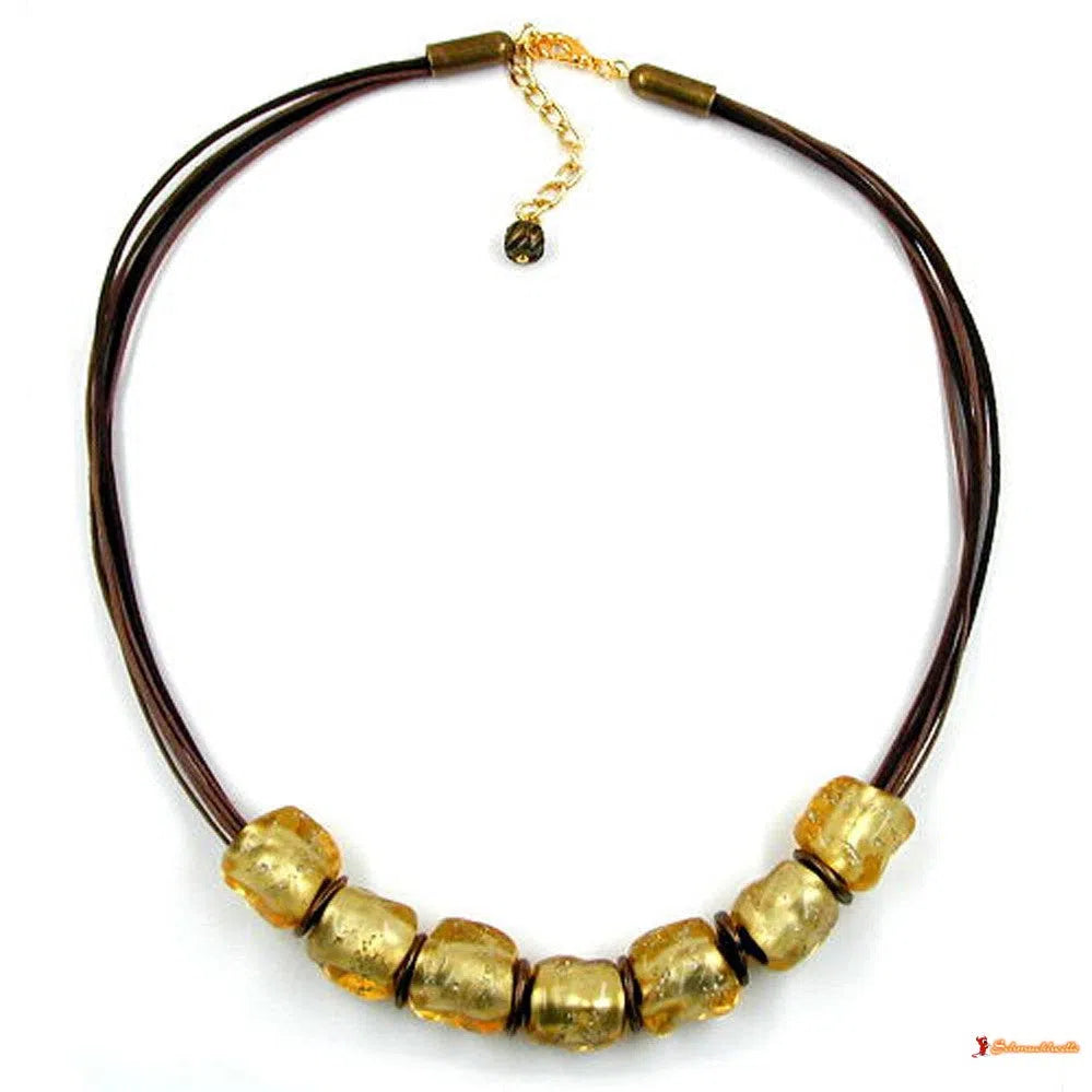 sommerliches Collier mit hochwertigen steinförmigen Kunststoffperlen gelb-transparent gold-verspiegelt in Kombination mit Ringen altmessing, 4-fach Kordel hellbraun und 2-fach Kordel oliv, Verschluss vergoldet mit Verlängerungskettchen und Perle als Abschluss