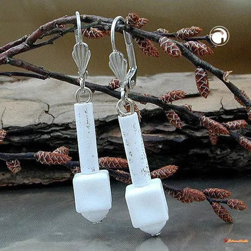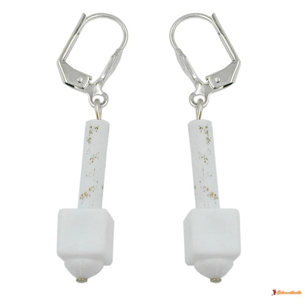 Der Ohrhänger besteht aus einer sorgfältigen Kombination von drei hochwertigen Kunststoffperlen: einer kegelförmigen weißen Endperle, einer 8mm großen weißen Würfelperle und einem 15x3mm großen Röhrchen, welches mit kleinen goldfarbenen Einsprengseln verziert ist. Diese Vielfalt verleiht den Ohrringen eine besondere Eleganz und macht sie zum Blickfang.