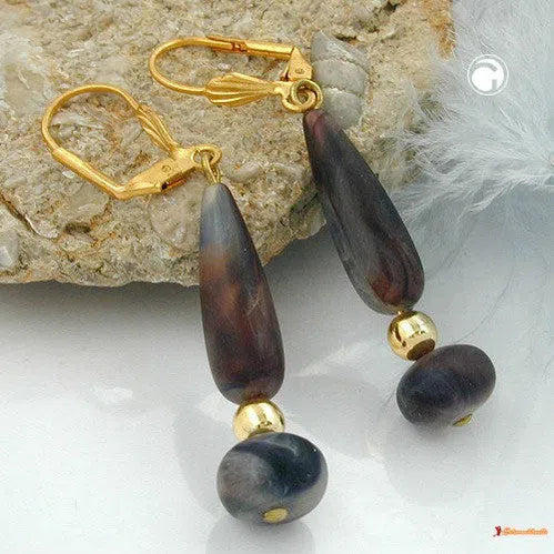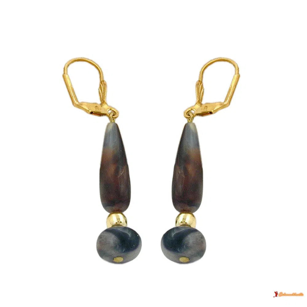 Diese leichten Modeschmuck-Ohrringe mit Klappbügel setzen den passenden i-Punkt zu dem Naturtrend in Ihrer Kleidung. Der Ohrhänger besteht aus einem Pendel mit einer tropfenförmigen und einer gedrückten dunkelhorn-farben-marmorierten Kunststoffperle, kombiniert mit einer goldfarbenen 6mm-Rundperle, befestigt an einer goldfarbenen Ohrbrisur aus Messing, Gesamtlänge: 55mm. Alle Bestandteile des Ohrschmucks wurden in Deutschland produziert und in Handarbeit - made in germany - fertiggestellt. Verkauf paarweise.