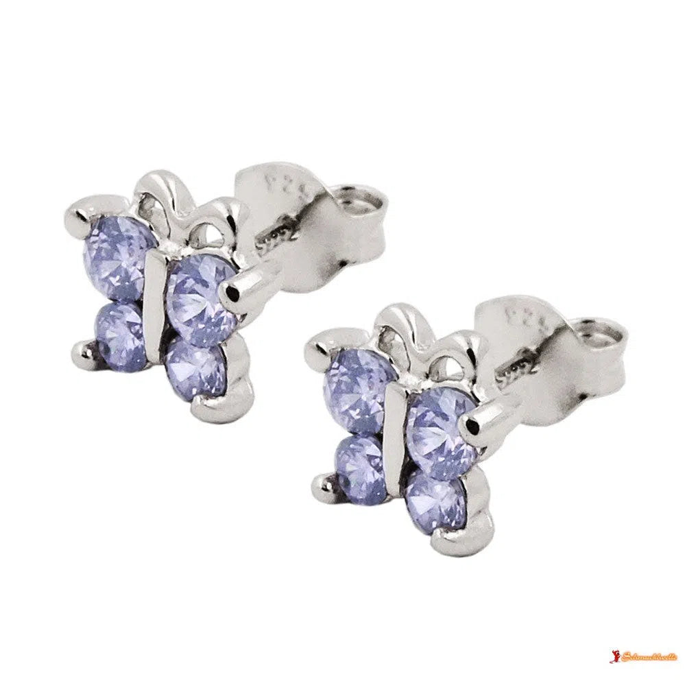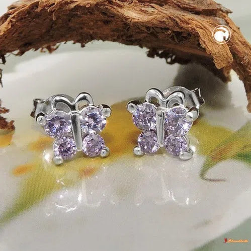 Wunderschöne 7x8mm kleine Ohrstecker Schmetterling in Sterling Silber 925 mit lilafarbigen Zirkonias, ein tolles Geschenk für kleine modische Mädchen, zum Geburtstag, Schuleinführung oder einfach als kleine Überraschung zwischendurch! Die Schmetterlinge tragen jeder als Flügel 4 lavendelfarbig eingefärbte Zirkonias. Für langanhaltende Freude an diesem Schmuckstück wurde die Oberfläche anlaufgeschützt rhodiniert.