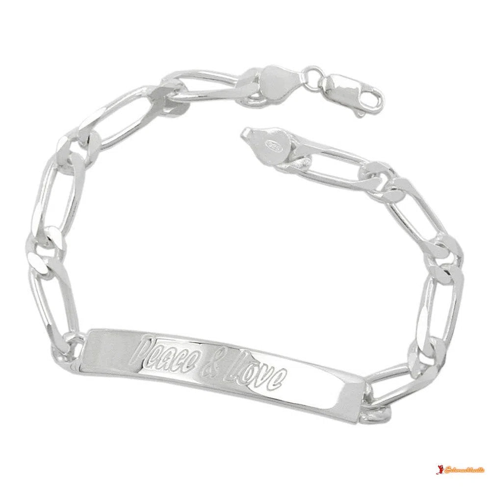 Das Schildarmband 65x2mm Figarokette Gravurplatte 45x7mm Peace & Love glänzend Silber 925 21cm ist mehr als nur ein Accessoire; es ist ein Ausdruck von Stil und Persönlichkeit. Überraschen Sie Ihre Liebsten mit diesem besonderen Schmuckstück, das sowohl elegant als auch bedeutungsvoll ist.
